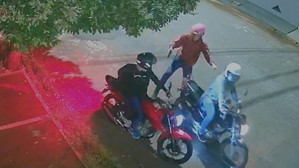 A perseguição durou aproximadamente dois quilômetros até que a vítima parou a moto e foi abordada pelos criminosos. Imagens de câmeras de segurança mostram o momento em que o garupa da moto dos suspeitos desce, aponta uma arma para a vítima e a empurra ao chão. Em seguida, o ladrão foge levando a moto, de placa PXZ-1C45.