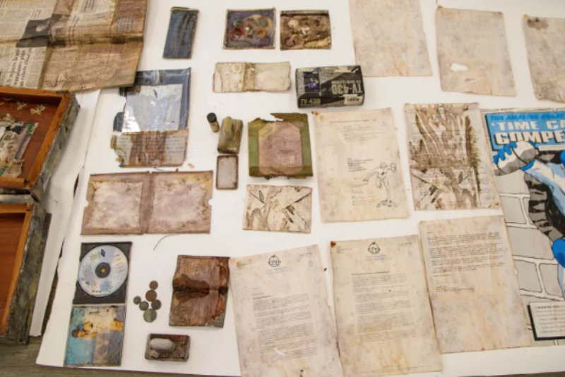 Entre os itens preservados em uma caixa de chumbo estavam um CD da cantora australiana Kylie Minogue, um passaporte europeu, moedas britânicas, uma calculadora e sementes de árvores. Crianças que participaram da seleção também incluíram uma TV de bolso, um holograma de floco de neve e uma folha de papel reciclado.