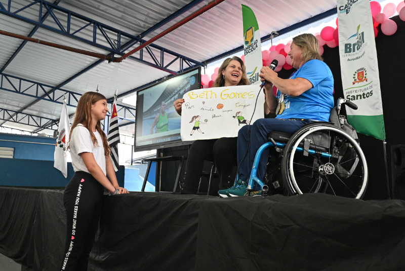 Mais de 200 alunos da UME Leonardo Nunes (Areia Branca) viveram uma manhã inesquecível nesta quinta-feira (8), quando receberam a visita de Beth Gomes, tetracampeã mundial paralímpica, no evento “Campeão na Escola”. A ação, promovida pela Fundação Pró-Esporte de Santos (Fupes) em parceria com as secretarias municipais de Educação (Seduc) e de Esportes (Semes), contou com o apoio da Brasil Terminal Portuário (BTP) e teve como objetivo inspirar e motivar as crianças com a história de superação e conquistas da atleta.