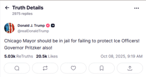 Em sua rede social, Trump disse: “O prefeito de Chicago deveria estar na cadeia por falhar em proteger os Oficiais do ICE (Serviço de Imigração e Alfândega dos EUA)! Governador Pritzker (Illinois) também!”