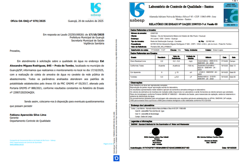 A Prefeitura de Guarujá, por sua vez, publicou uma nota afirmando que não há motivo para alarde e que a situação foi monitorada desde o início em conjunto com a Sabesp. A administração municipal informou ainda que a solicitação de análise partiu da reclamação de um morador, e que foi feito pedido de laudo técnico à Sabesp. Também alertou para a legitimidade de um documento (cuja autenticidade não pôde ser confirmada) que circula nas redes sociais sem assinatura do secretário ou numeração protocolar.