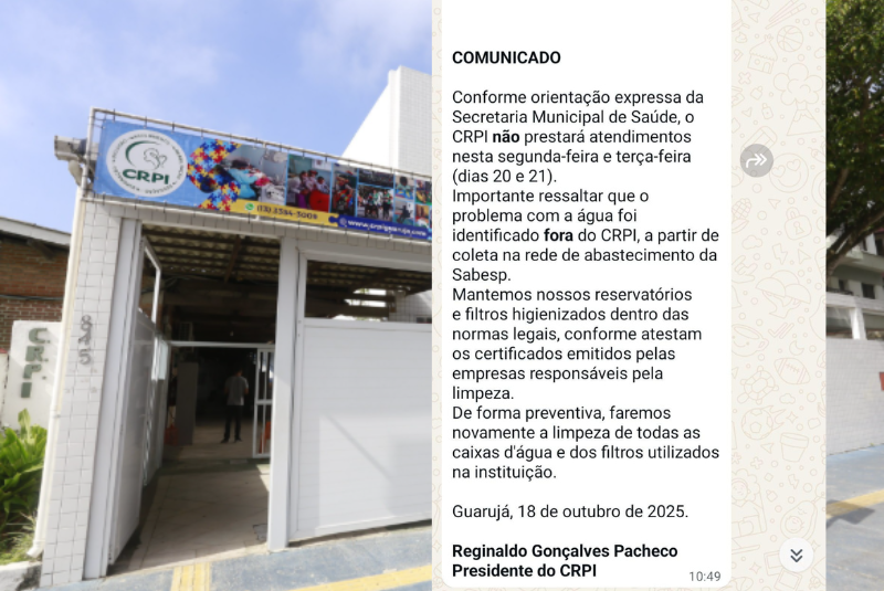 O Centro de Recuperação e Prevenção Infantil (CRPI), em Guarujá, suspendeu os atendimentos desde da última sexta-feira (17). A medida foi recomendada pela Secretaria Municipal de Saúde, após uma visita da Vigilância Sanitária que indicou possível contaminação na rede de abastecimento da Sabesp.