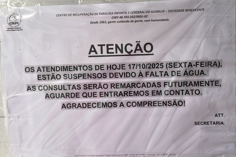 O Centro de Recuperação e Prevenção Infantil (CRPI), em Guarujá, suspendeu os atendimentos desde da última sexta-feira (17). A medida foi recomendada pela Secretaria Municipal de Saúde, após uma visita da Vigilância Sanitária que indicou possível contaminação na rede de abastecimento da Sabesp.