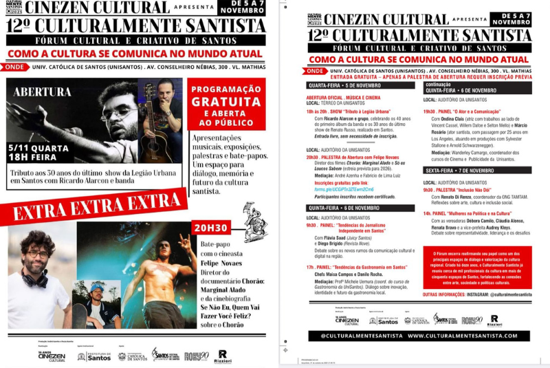 De 5 a 7 de novembro acontece o 12º Culturalmente Santista – Fórum Cultural e Criativo de Santos, realizado pelo Instituto CineZen Cultural, com apoio institucional da Prefeitura Municipal de Santos e da Universidade Católica de Santos (UniSantos), além do Santos Film Fest – Festival de Cinema de Santos, Rizzieri Eventos e Cine Roxy.