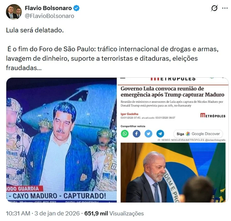 Segundo a representação apresentada à pasta da Justiça, a postagem teria associado o presidente da República e o Foro de São Paulo a acusações graves, como envolvimento com organizações criminosas, tráfico internacional, lavagem de dinheiro e fraudes eleitorais, sem apresentação de provas. O conteúdo foi publicado no contexto de notícias envolvendo o presidente da Venezuela, Nicolás Maduro.