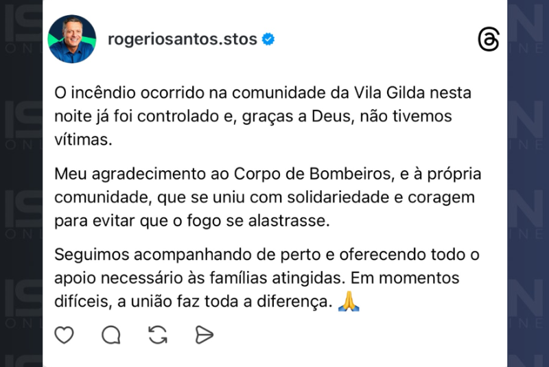 Um incêndio de grandes proporções atingiu a comunidade do Dique da Vila Gilda, na Zona Noroeste de Santos (SP), na noite de terça-feira (27). Segundo o Corpo de Bombeiros, as chamas se espalharam por aproximadamente 300 m² da maior favela sobre palafitas do Brasil, localizada na Rua Caminho São José, no bairro Rádio Clube.