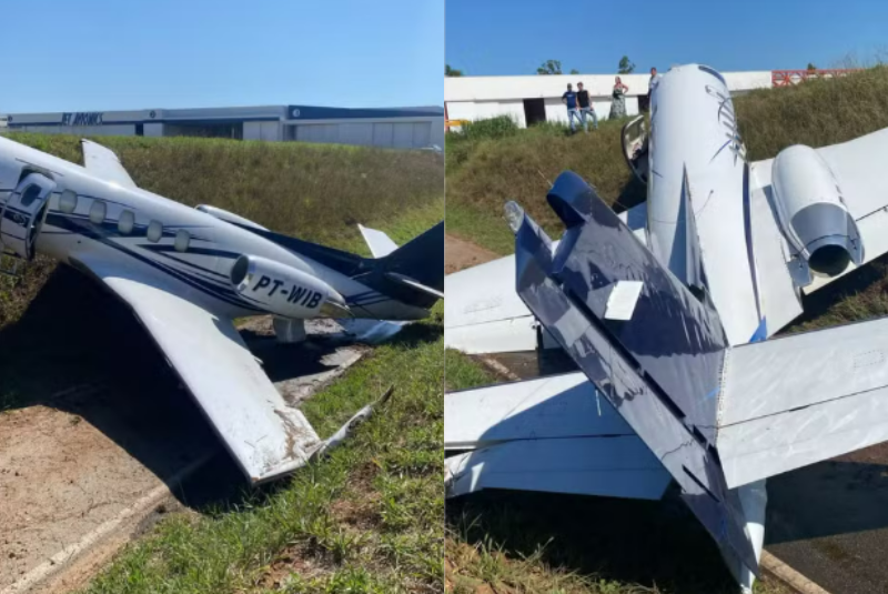 Segundo as informações, no momento do pouso o jato acabou saindo da pista e atingiu um barranco localizado na entrada de veículos para um hangar do aeroporto.